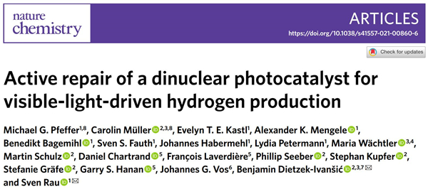 文献链接Active repair of a dinuclear photocatalyst for visible-light-driven hydrogen production(Nature Chemistry DOI: 10.1038/s41557-021-00860-6)。