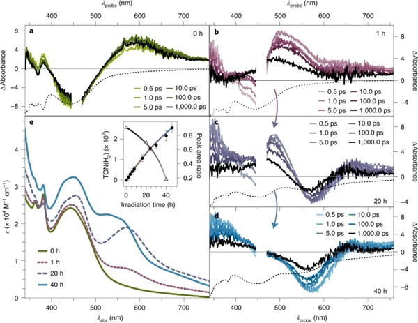 图 3 不同辐照时间下催化溶液的紫外–可见光谱和超快瞬态吸收光谱 ©2022 Springer Nature
