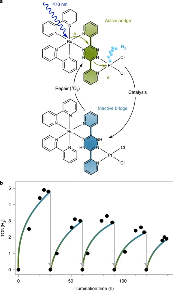 近日,德国乌尔姆大学的Sven Rau和耶拿大学的Benjamin Dietzek-Ivanšić(共同通讯作者)等人发现由光中心、桥配体和催化中心组成的用于人工光合作用的仿生分子装置,在其单个模块结构受损时,可能会变得不稳定并发生故障,从而停止其整体功能和运行。本文报告了一种主动修复的人工光合分子装置,可以完全恢复催化活性。本文确定失活机制是桥配体的氢化作用,它抑制光中心和催化中心之间的光驱动电子转移。本文采用光驱动的单线态氧生成,在光中心的催化下,实现桥接单元的氧化脱氢,从而恢复光催化制氢。相关成果以“Active repair of a dinuclear photocatalyst for visible-light-driven hydrogen production”发表在Nature Chemistry上。