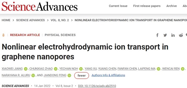 文献链接:Nonlinear electrohydrodynamic ion transport in graphene nanopores ( Science Advances 2021, DOI: 10.1126/sciadv.abj2510)