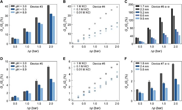 (e)7.2 nm石墨烯纳米孔器件#5在不同离子浓度(0.01,0.1和1 M KCl)下机械敏感电导变化率Gstr/G0