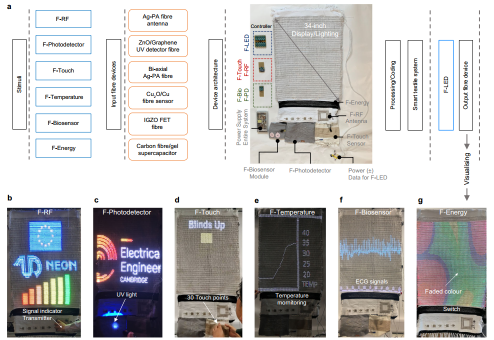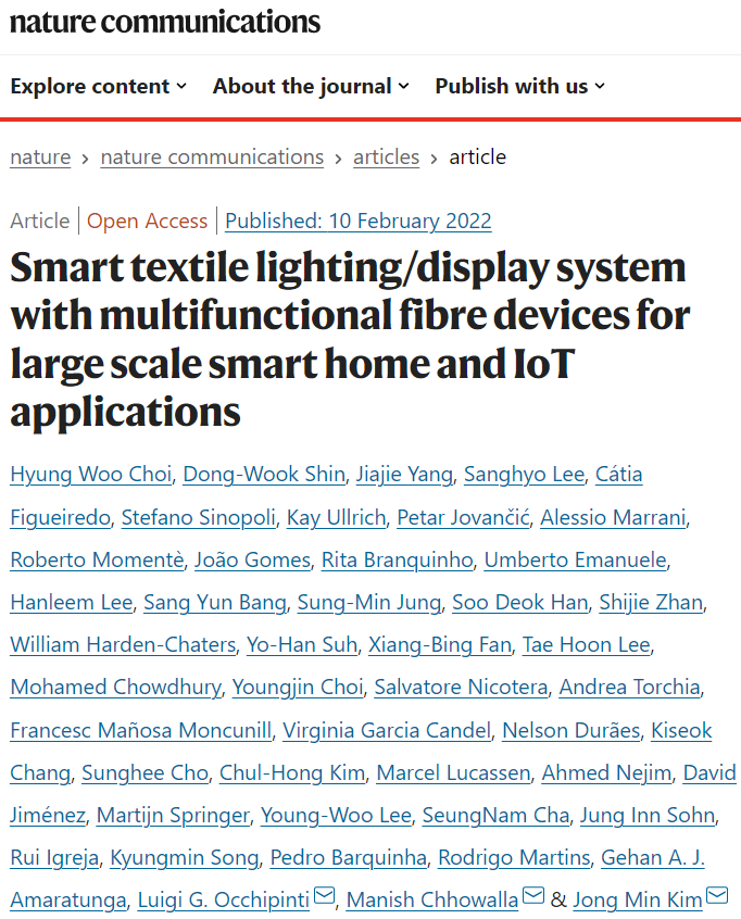 来自剑桥大学的Luigi G. Occhipinti、Manish Chhowalla和Jong Min Kim团队报告了一种可操作的46英寸智能纺织品照明/显示系统的技术,该系统由RGB光纤LED和多功能光纤器件组成,能够进行无线电力传输、触摸传感、光检测、环境/生物信号监测和能量储存。该智能纺织品显示系统具有完全自由的外形,具有灵活性和可弯曲性。作为一种真实的RGB照明控制的全色显示设备,该系统具有嵌入式光纤设备,可提供外部刺激的检测功能。本文的系统设计和集成策略具有通用性,为在智能家居和物联网(IoT)上实现革命性应用的大面积高功能智能照明/展示纺织品奠定了基础。相关工作以题为“Smart textile lighting/display system with multifunctional fibre devices for large scale smart home and IoT applications”的研究性文章在《Nature Communications》上发表。