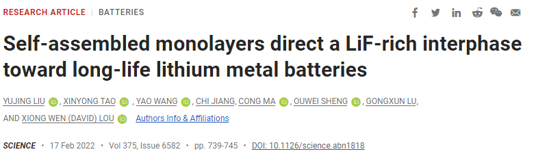 文献链接:“Self-assembled monolayers direct a LiF-rich interphase toward long-life lithium metal batteries.” Science. DOI: 10.1126/science.abn1818