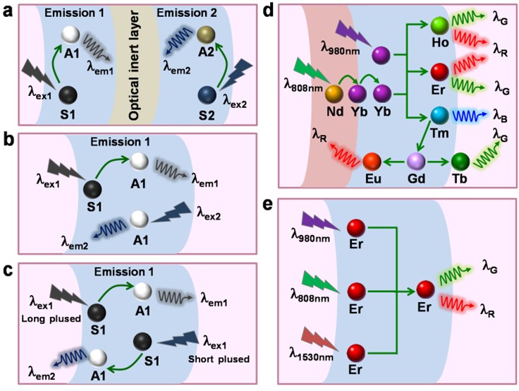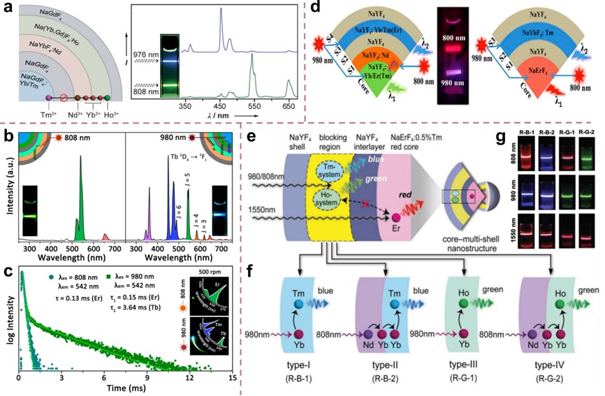 稀土掺杂上转换发光材料具有优异的光子上转换性能和良好的物理化学性质,近年来在光学基础研究和各种前沿应用中引起了极大的关注。特别是上转换纳米粒子(UCNPs)的成功制备推动了光子上转换在发光机制、光谱调控和前沿应用的迅速发展,取得了一系列具有重要意义的研究成果。与传统的纳米粒子相比,多层核壳(Multi-layer core-shell, MLCS)纳米结构UCNPs是近期开发的一类新型纳米材料,在粒径、形貌、尺寸、成分、纳米结构和表面性质具有更好的灵活性和多功能性,提供了一个理想的可以灵活调控光子上转换性质的纳米平台,例如在单颗粒水平上调整发光颜色、荧光寿命、可切换多色正交发光以及多功能集成。此外,MLCS纳米结构也有助于实现纳米尺度上对镧系离子间相互作用和发光动力学的精确控制,为深入理解能量传递过程和稀土光谱学创造了条件。因此,阐明MLCS材料体系的设计原则,突出MLCS纳米结构在能量输运、微观尺度相互作用、光色/寿命调控和多功能应用集成中的重要性,对于进一步推动上转换发光领域的发展具有重要的科学意义。