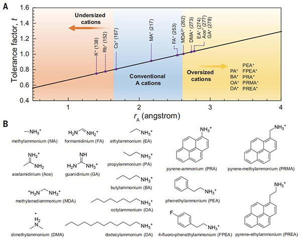 (A)选择的在OLHPs领域取得重大突破的A阳离子,根据其阳离子半径和基于APbI3晶格框架的相应容差因子进行分类;