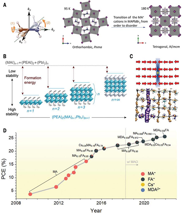 OLHPs的化学通式为ABX3,其中A代表一价阳离子,B代表二价铅阳离子,X是卤化物阴离子。在其最初的发展过程中,A阳离子主要限于三种候选物,即甲基铵(MA+)、甲脒(FA+)和铯(Cs+),它们由尺寸和结构限制决定以适应OLHPs晶格。由于A阳离子本身并不直接影响OLHPs结构,因此传统上认为它几乎不会影响OLHPs的光电特性。然而,近年来的进步揭示了A阳离子在确定OLHPs的光电和物理化学性质方面的关键作用。通过使用A阳离子微调OLHPs的性质,该领域取得了重大突破,包括 :(i)理想OLHPs相的热力学或动力学稳定,特别是亚稳态立方三碘化铅多晶型物;(ii)通过静电相互作用或空间效应阻止离子迁移;(iii)表面和界面功能化和改性。这些研究方向现在处于OLHPs研究的前沿,最终决定了基于OLHPs的光电设备的实用性、功能、性能和稳定性。