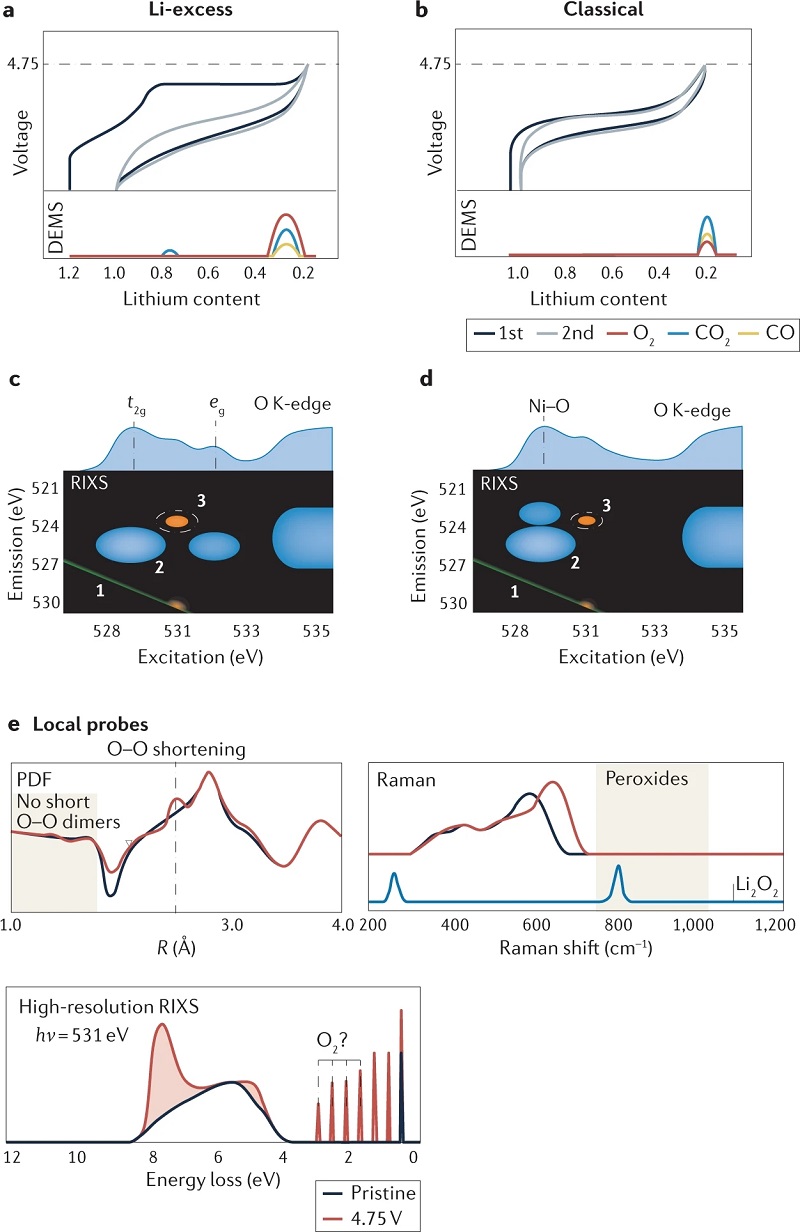 近年来,科学家们已提出了几种机制来解释这些材料的过剩容量,包括未杂化的O 2p轨道氧化形成局部电子空穴对等,但是导致Li过剩和相关正极材料异常过剩容量的氧化还原机制一直存在争议,很可能多种机制促成了不同阴离子氧化还原系统的行为。此外,确定一种精确的阴离子氧化还原机制的障碍是关于Li过量材料的文献对于阴离子氧化还原的定义含糊不清。由于缺乏能够将阴离子氧化还原与正极材料中发生的其他不可逆反应区分开来的直接表征技术,机理研究变得更加复杂。
