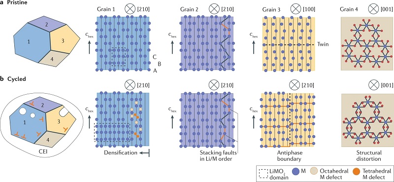 近日,美国加州大学圣地亚哥分校(UCSD)孟颖(Y. Shirley Meng)教授、加州大学圣塔芭芭拉分校(UCSB)Anton Van der Ven和英国沃里克大学Louis F. J. Piper(共同通讯作者)等人报道了一篇关于阴离子氧化还原的机制,以及可能发生在层状过渡金属氧化物中的相应动力学途径的综述。在文中,作者对阴离子氧化还原材料的不同反应进行了系统化总结,包括电化学过程和结构转变。作者专注于基于3d过渡金属的层状氧化物正极,因为其在使用碳酸盐基电解质的锂离子二次电池中取得了成功。首先,作者讨论了这些模型材料的晶体结构,以定义可能发生阴离子氧化还原的键合环境类型。然后,作者列举并定义了已提出来解释阴离子氧化还原的过量容量的可能来源及其与观察到的电化学的关系。接着,作者总结了已报道的伴随阴离子氧化还原的结构转变,并将它们与不同氧化还原机制所暗示的动力学途径和晶体学变化联系起来,重点是缺陷的形成。最后,作者回顾了广泛用于研究阴离子氧化还原的实验和计算技术,并对该领域的关键问题进行了讨论。研究成果以题为“Pushing the limit of 3d transition metal-based layered oxides that use both cation and anion redox for energy storage”发布在国际著名期刊Nature Reviews Materials上。