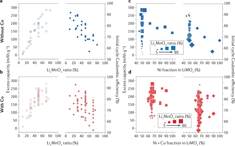 (b)Li-过量Li1+x(Ni1-x-y-zMnyCoz)O2(NMC)的剩余容量和初始循环库仑效率作为Li2MnO3比例的函数;