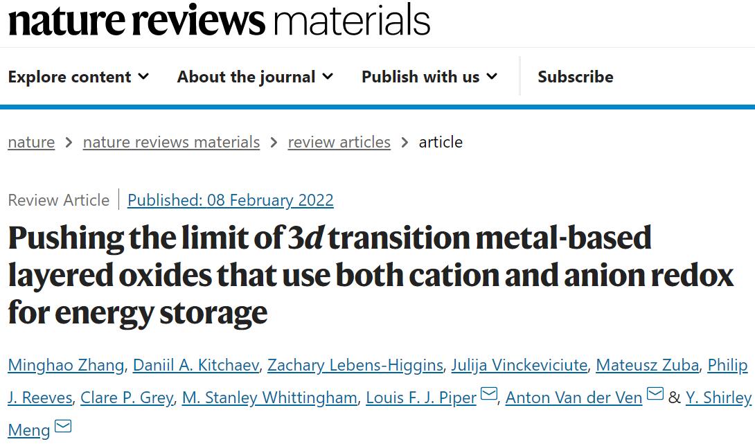 文献链接:Pushing the limit of 3d transition metal-based layered oxides that use both cation and anion redox for energy storage. Nature Reviews Materials, 2021, DOI: 10.1038/s41578-022-00416-1.