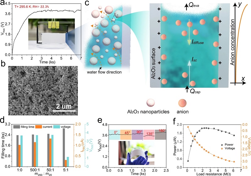 近日,中科院苏州纳米技术与纳米仿生研究所张珽研究员(通讯作者)等人报道了一种热传导效应增强的水力发电机(hydrovoltaic power generator, HCEHG),即通过在多孔的双尺寸Al2O3(d-Al2O3)背面上合理地集成柔性离子热电(ionic thermoelectric, i-TE)明胶,构建了一个HG作为热传导层,以提高蒸发电能输出,并保持持续的热电转换而无需任何特殊的环境要求。在发电机中,i-TE材料可以改善d-Al2O3膜和附近环境之间的热传导提高水的蒸发率。其中,在温度为294.6 K和30%相对湿度(RH)下,将HG的性能提高到4.0 V。在HG模块的协同作用下,连续蒸发的水可以为热电发电机提供约2.0 K的恒温温差。更重要的是,热电组件的黑色表面可以有效地将太阳辐射转化为热量,温差达到4 K,在1个标准太阳(1 standard sun)下,水电部分的开路电压(Vhoc)稳定在6.4 V,这是所报道的水电发电机的最大值。此外,所产生的电能不仅可以存储在商用超级电容器中,而且还可以直接驱动数字计算器等电子设备,或者用作可穿戴设备的能源供应平台。研究成果以题为“IEnhancing hydrovoltaic power generation through heat conduction effects”发布在国际著名期刊Nature Communications上。
