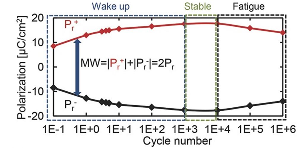 除了生长参数,外界激励,如温度、电场均会影响HfO2多晶薄膜相结构及铁电性。随着温度升高,Pca21相逐渐演化为高温稳定相P42/nmc,与此对应,材料出现铁电性到反铁电性的转变,见图3。与温度相比,电场的作用更加重要。铁电存储器件使用期间,需要在循环电场下保持稳定。而在HfO2铁电薄膜中,循环电场会先引起Pr增强,称为“唤醒效应 (wake-up)”,再引起Pr退化,到达“电疲劳 (fatigue)”状态,见图4。HfO2 铁电薄膜具有显著的唤醒效应,这种现象与电场作用下多晶膜内部相变、缺陷重新分布、以及极化电荷注入均有关系;而电疲劳现象可能与薄膜内部氧空位沿晶界的积聚形成导电通道有关,见图5。