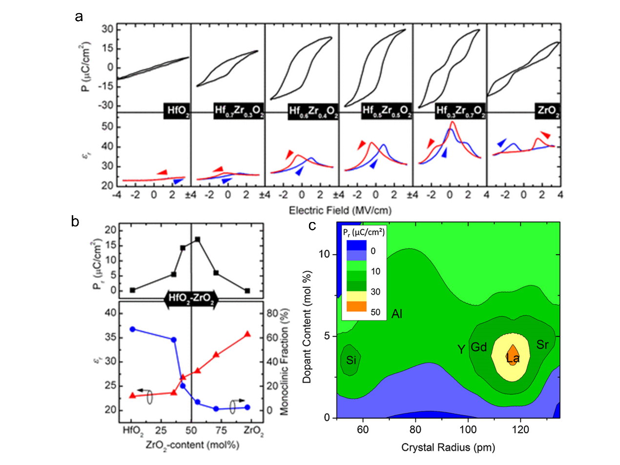 图 2 随Zr含量增加(a)出现顺电-铁电-反铁电演化及(b)相对应的Pr及P21/c相比例减小,(c)掺杂剂原子半径大小及浓度对Pr的影响 © 2022 The Authors