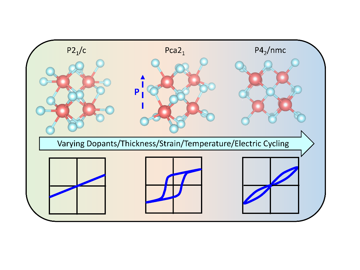HfO2晶体的热力学稳定相均为中心对称的晶体结构,目前经实验确定的铁电相均是亚稳相,包括非中心对称的正交相Pca21以及菱形相。这两种亚稳相大多存在于纳米厚度的掺杂态薄膜中,且易随生长参数或外部激励的改变而转变为顺电相或反铁电相,见示意图1,严重影响器件的铁电性能。近年来,大量文献报道了通过生长参数/外部激励对HfO2铁电性的调控,以及稳定铁电相的热/动力学规律。但是,现有的综述大多是关于HfO2铁电性能及器件物理的,几乎没有综述侧重于HfO2结构演化与性能调控的关系。