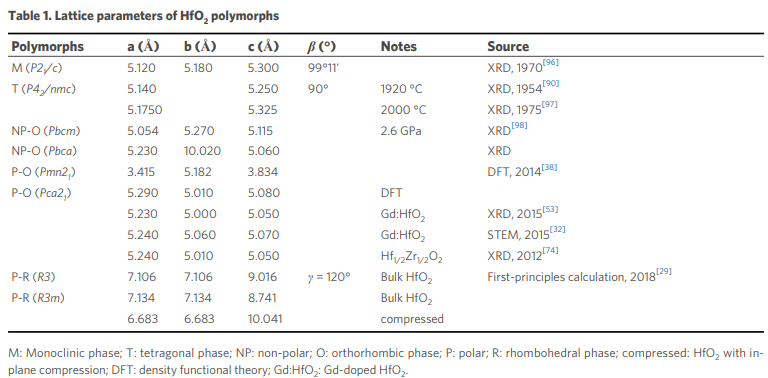 表1. 通过实验测量或计算预测的HfO2的多种晶体结构及晶胞参数 © 2022 The Authors