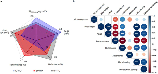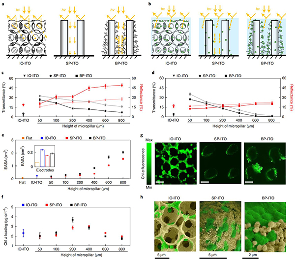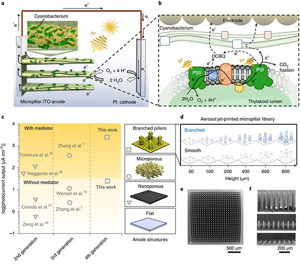 英国剑桥大学Jenny Z. Zhang教授(通讯作者)等人开发了一种使用氧化铟锡(ITO)纳米颗粒生成分层电极结构的气溶胶喷墨打印方法,打印了不同高度和亚微米表面特征不同的微柱阵列电极,并研究了生物电极界面的能量/电子转移过程。当连接到蓝藻(Synechocystis sp. PCC 6803)时,具有微分支的微柱阵列电极表现出良好的生物催化剂负载、光利用率和电子通量输出,最终使相同高度下最先进多孔结构的光电流几乎翻了一番。同时,当微柱的高度增加到600 µm时,介导的光电流密度可以达到245 µA cm–2(迄今为止最接近理论预测)和高达29% 的外部量子效率。这项研究展示了如何在未来更有效地利用光合作用产生的生物能,并为三维电极设计提供新的理论。