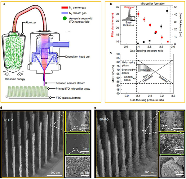 图二、微柱阵列电极的气溶胶喷墨打印 © 2022 Springer Nature(a)打印过程示意图;