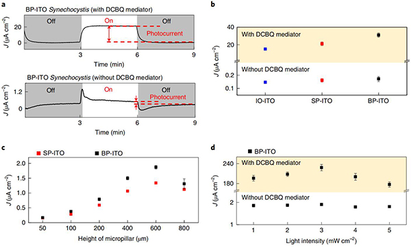 图四、生物负载电极的光电化学性能 © 2022 Springer Nature(a)存在和不存在外源电子穿梭DCBQ(1 mM)的情况下,从负载的BP-ITO电极获得的代表性光电流分布;