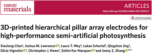 文献链接:“3D-printed hierarchical pillar array electrodes for high-performance semi-artificial photosynthesis”(Nature Materials,2022,10.1038/s41563-022-01205-5)