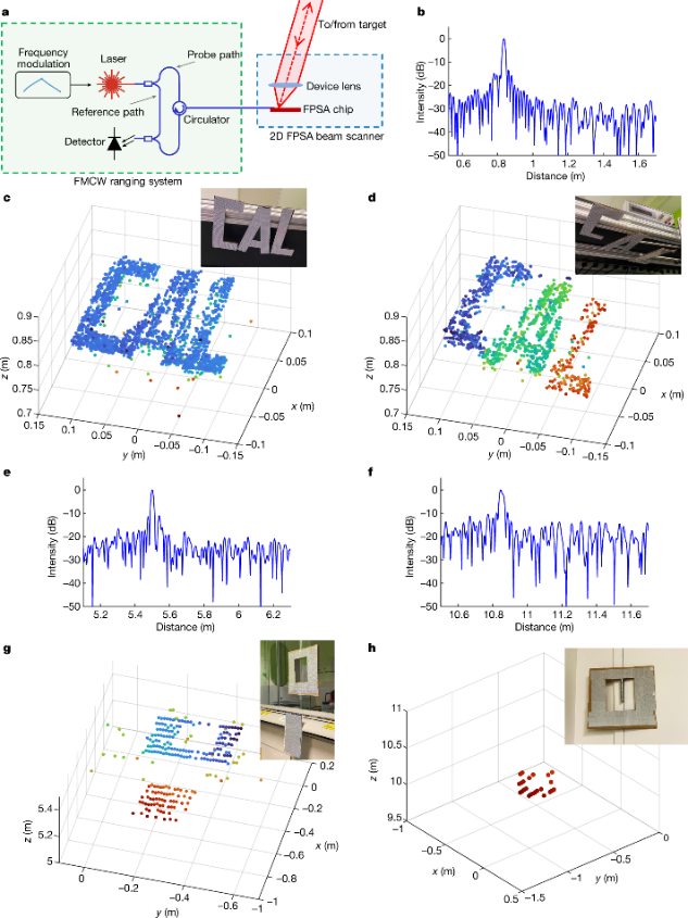 (a) FMCW激光雷达与FPSA光束扫描仪示意图。(b)目标在0.84 m处具有代表性的FMCW激光雷达光谱。(c-d)三个字母组成的目标在大约0.8 m处同一平面(c)和不同平面(d)的点云和相机图像;(g-h)在约5.2m和10m处目标的点云和相机图像。