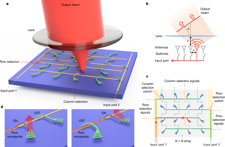 a,二维 FPSA透视图示意图。b,一维FPSA光束扫描仪原理图。c,设计的2D FPSA顶视图。d, MEMS光开关和光栅天线的原理图。