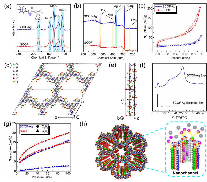全球每年丙烯产量达120MMt,是一种重要的化工原材料。丙烯生产路径主要是石油裂解,反应产物中不可避免的会含有一定量的丙烷,而下游生产所需丙烯纯度通常很高,需要达到99.60%才可。因此,必须对丙烯/丙烷进行分离。据估计,每年用于烯烃与烷烃分离的能耗约占全球总能耗的0.3%,因此,烯烃/烷烃分离被公认为是改变世界的七大化工分离任务之一,开发烯烃与烷烃的高效分离技术对于现代化工可持续发展具有重要意义。膜技术可在常温或较低温度下操作,过程无相变,能耗低,清洁低碳,且膜技术能耗仅为精馏技术的1/10左右,因此如果膜技术可以替代传统的低温精馏技术进行丙烯丙烷分离,每年可为国家节省大量的数亿千瓦时的能源。膜材料是膜技术的核心,而膜技术未能在丙烯/丙烷分离领域大规模应用主要就是受限于缺乏高性能的膜材料。共价有机框架(COFs)材料因其孔隙发达、结构规整、易于后修饰等特点,被视为理想的气体分离膜材料,但是COFs的孔径范围通常在1-3 nm之间,而气体分子的动力学直径一般在0.3-0.5 nm的范围内,COFs较大的孔径无法实现对气体小分子的精准筛分,限制了其在气体分离领域的应用。