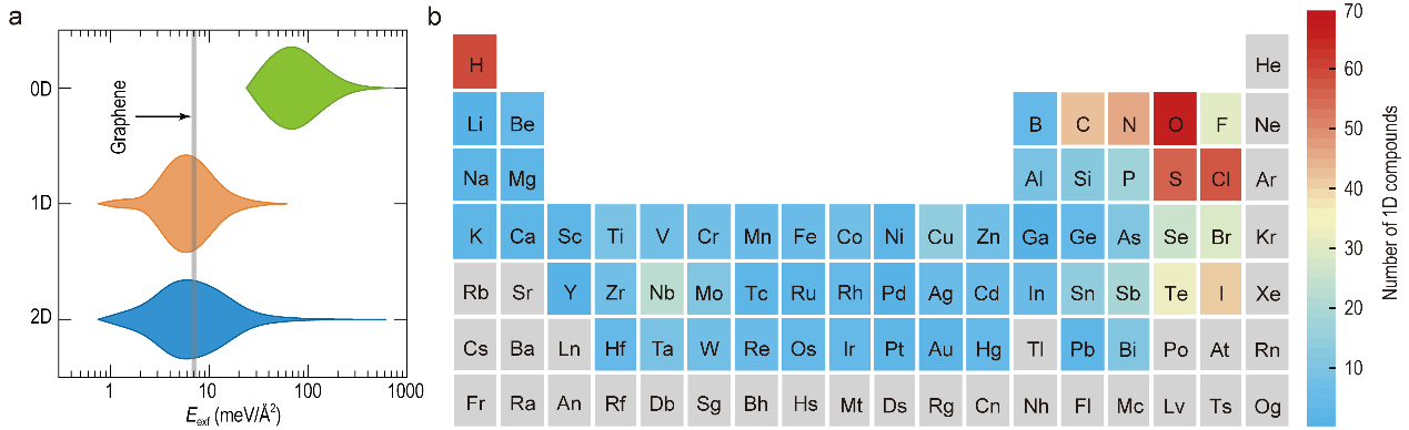 图二、低维材料的剥离能分布与一维材料的元素组成分布。(a) 2D、1D和0D化合物的剥离能分布的小提琴图。灰色线表示由石墨烯的剥离能定义的阈值。(b)一维材料中元素组分的数目统计图,其中灰色的元素代表其不存在于任何一维化合物中。