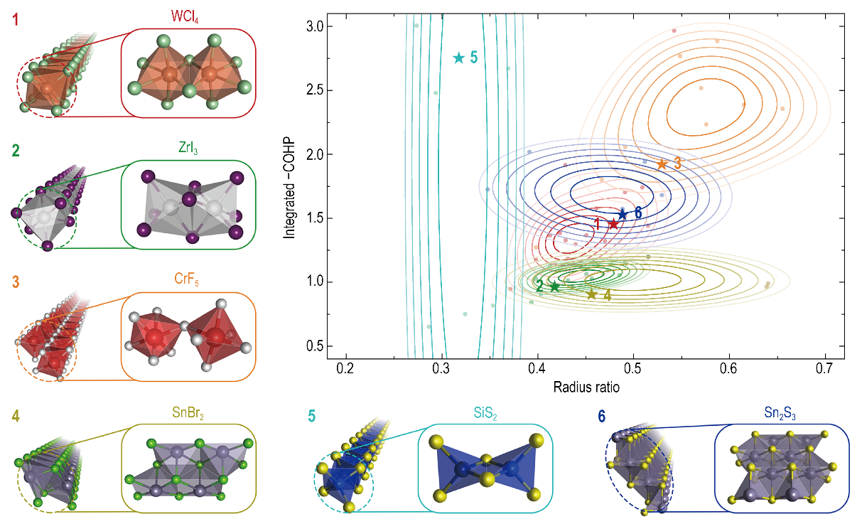 文中展示了基于图论方法分类得到的六种常见一维材料的结构类型。为了进一步分析材料的化学信息,研究团队从成键特性与原子尺寸效应两个方面进行研究。其中成键特性由晶体轨道哈密顿布居(COHP)的积分项来代表,原子尺寸效应由阳离子中心配位多面体中正离子和负离子的半径比作为量化指标。一维材料在化学空间的分布情况反映出相同结构类型的材料拥有相似的性质,说明了图论分类方法潜藏着对材料性质的分类。