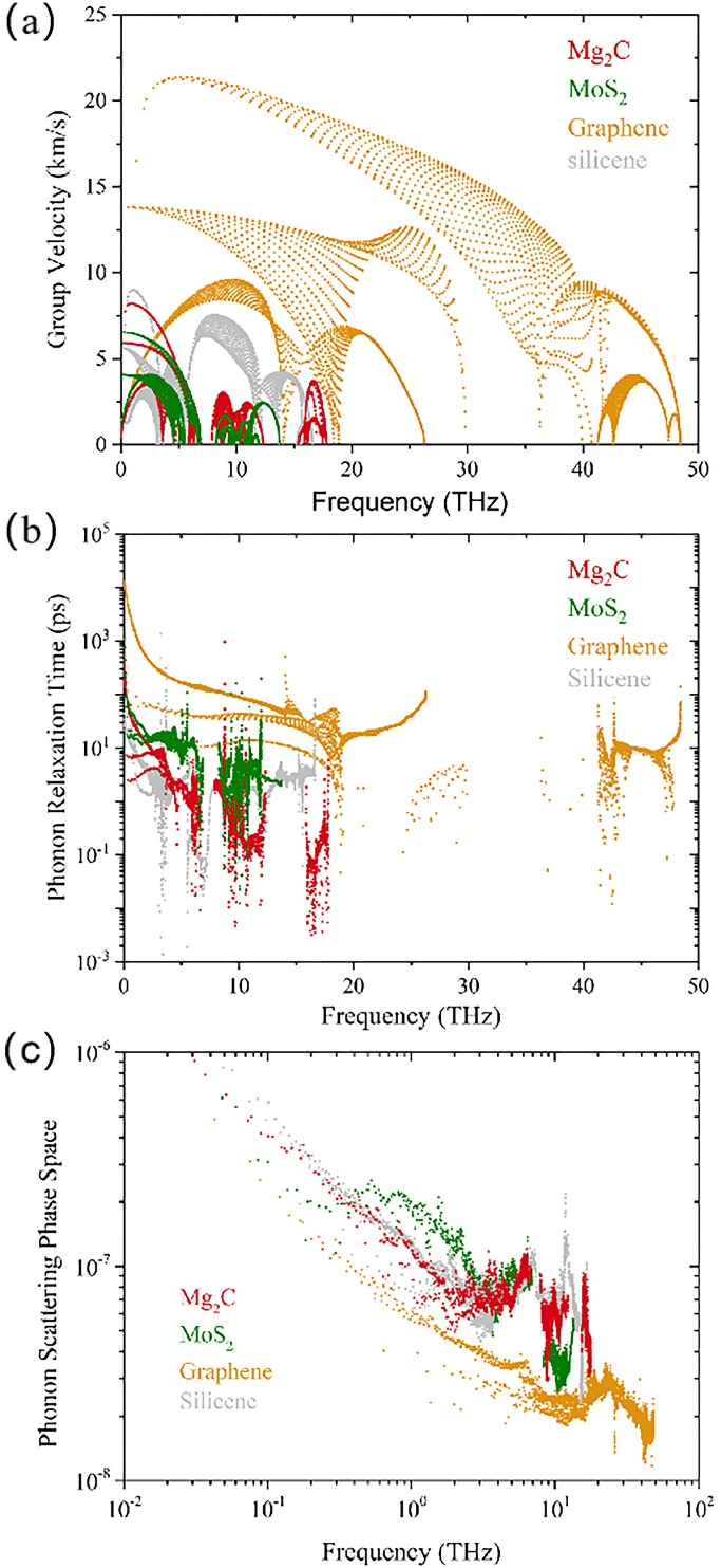 图3. Mg2C、MoS2、石墨烯和硅烯的群速度、声子弛豫时间、散射相空间的对比分析。