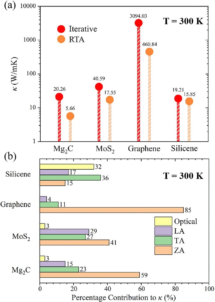 图2. Mg2C、MoS2、石墨烯和硅烯热导率及各声子分支对热导率的贡献百分比的对比分析。