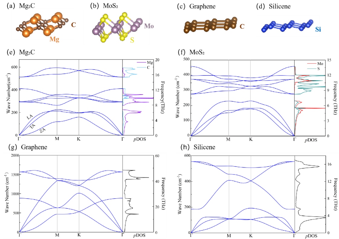 图1. 二维Mg2C、MoS2、石墨烯和硅烯的结构图及声子谱。