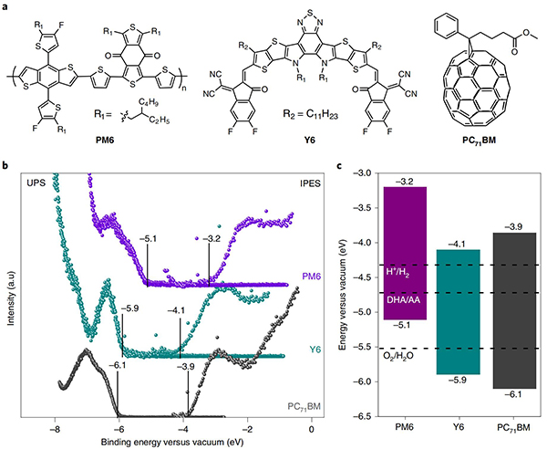 (a)有机半导体 PBDB-T-2F(PM6)、BTP-4F(Y6)和[6,6]-苯基C71丁酸甲酯(PCBM)的化学结构;