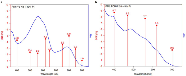 (a)具有10%Pt的PM6:Y6 7:3 NPs在400、500、560、620、650、750、800、850和900±10nm的EQE和吸收光谱;