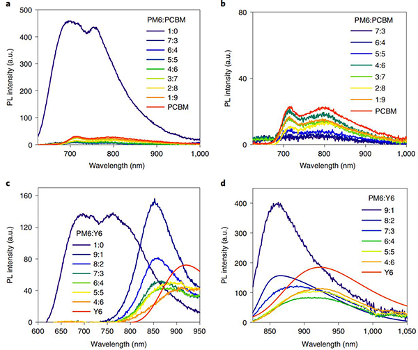 (c,d)不同的PM6:Y6组成比下PM6:Y6 NPs的稳态PL光谱。