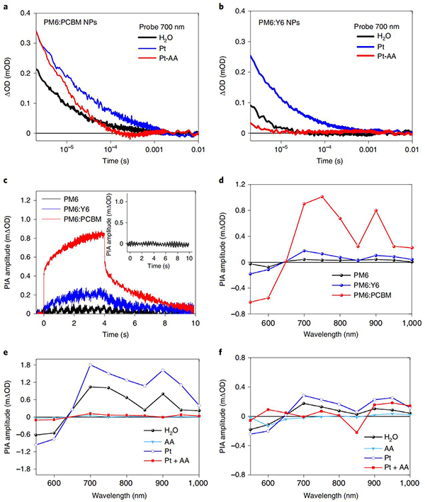 (c)在没有Pt和AA的情况下,在700 nm处探测PM6、PM6:PCBM 2:8和PM6:Y6 7:3 NPs悬浮液的PIAS动力学;