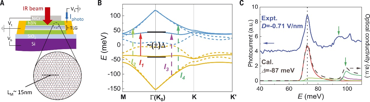 图1 ABC堆叠三层石墨烯/六方氮化硼超晶格trilayer graphenehexagonal boron nitride moiré superlattice (TLG/hBN) 器件结构和带间光学跃迁 © 2022 AAAS