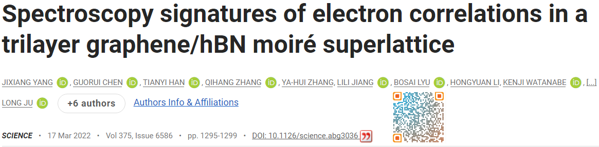 近日,麻省理工学院、上海交通大学、复旦大学、加州大学伯克利分校、日本国家材料科学研究所合作在理解二维材料电子相关性方面迈出了重要的一步。研究人员在Science上发表的题为“Spectroscopy signatures of electron correlations in a trilayer graphene/hBN moiré superlattice”的成果揭示了一种采用ABC构型堆叠的三层石墨烯/六方氮化硼(TLG/hBN)超晶格的二维材料中电子关联性的直接证据。这种材料先前已被证明可以从金属转变为绝缘体再到超导体。研究人员首次直接检测到材料特殊绝缘状态下的电子关联性。他们还量化了这些相关性的能量尺度,或电子之间相互作用的强度。结果表明,ABC构型的三层石墨烯可以成为探索和设计其他电子相关性的理想平台,例如驱动超导的电子关联性。