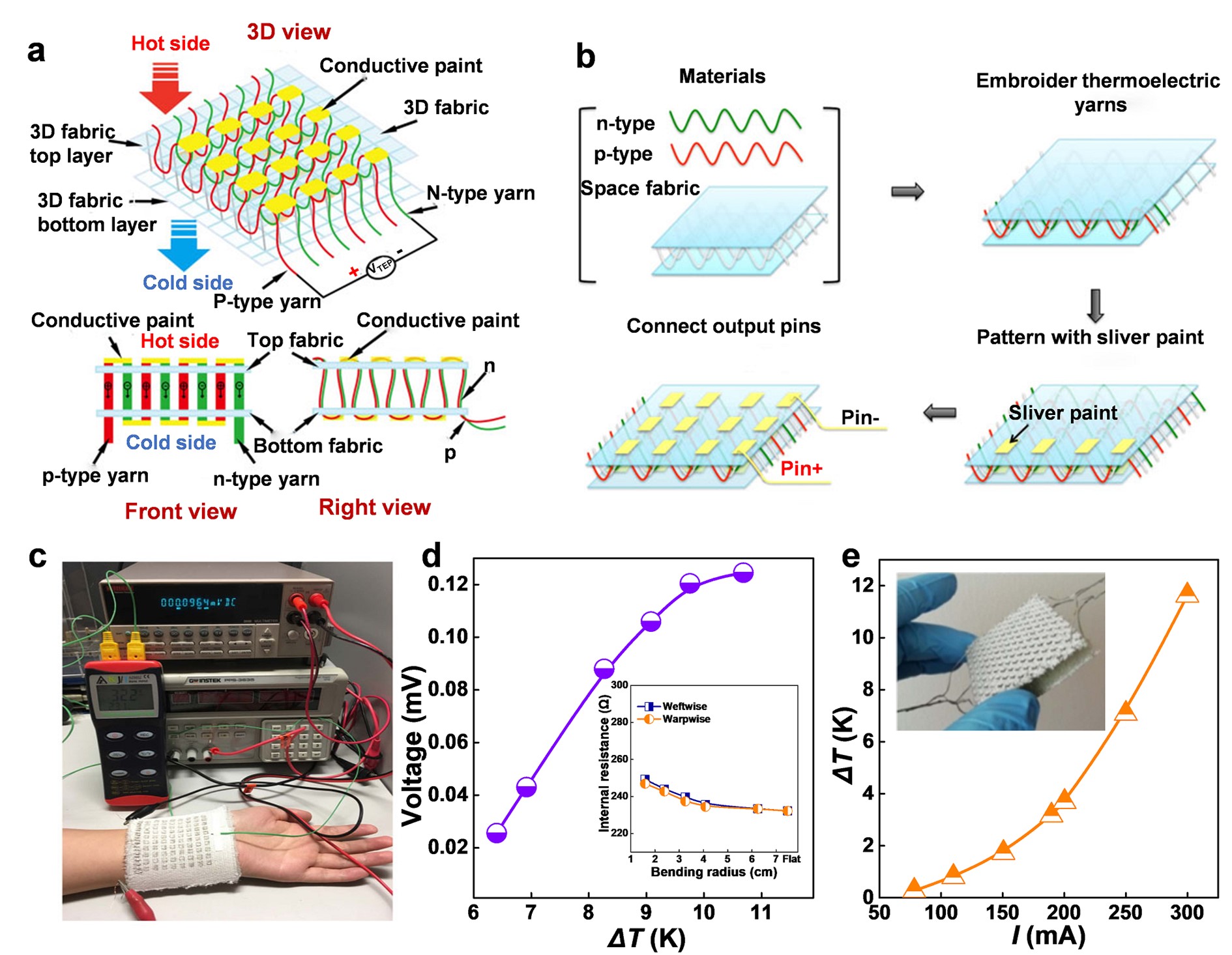 a) 利用热电纤维和3D织物基底的纤维基热电器件的结构设计,b) 器件设计流程示意图,c) 可穿戴热电器件的输出性能测量,d) 输出电压随时间的变化,插图展示了器件稳定 性测试的结果,e) 间隔织物底端和顶端的温差随流经热电器件电流的变化。