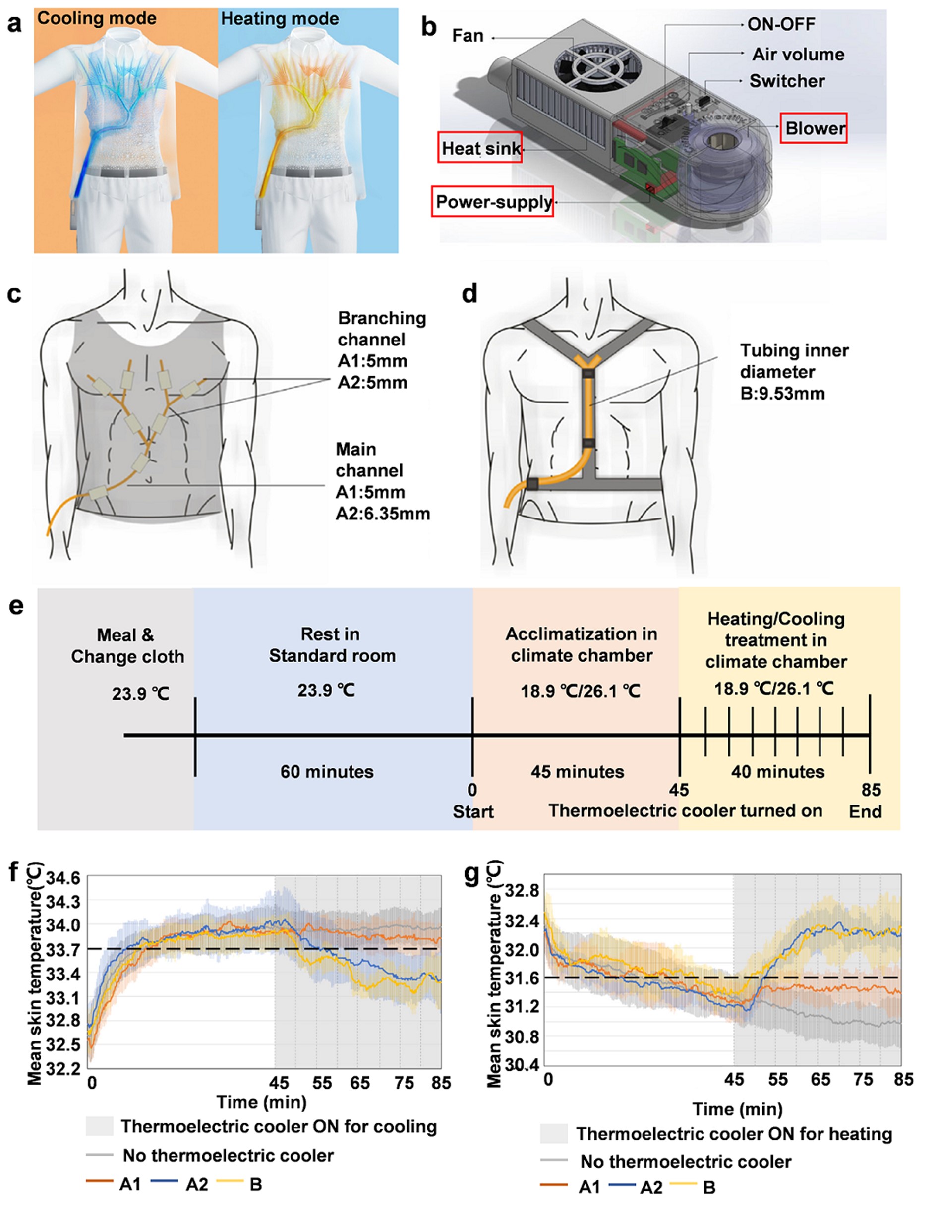 a) 热电式个人热管理在冷、热模式下工作示意图,b) 热电系统的3D视图,c) A1和A2管道系统设计原型,d) B管道系统设计原型,e) 热电式个人热管理人体测试的时间线,f) 热电式个人热管理在冷却实验中平均皮肤温度的变化,g) 热电式个人热管理在加热实验中平均皮肤温度的变化。