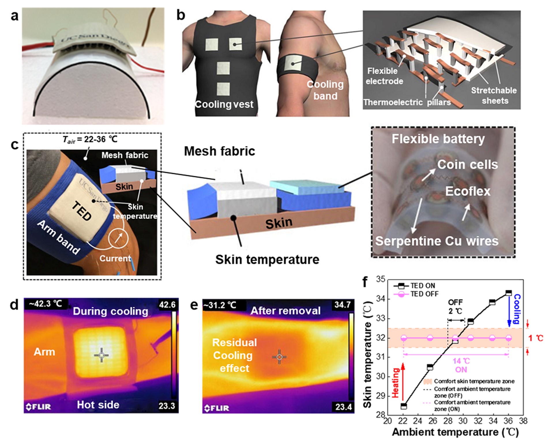 a) 柔性可穿戴热电器件在弯曲表面上的照片,b) 用于个人温度调节的柔性可穿戴式热电器件的原理图设计说明, 热电腿由柔性铜电极连接,c) 将柔性热电器件与臂带、薄多孔网状织物和柔性电池集成的示意图和照片,d) 集成热电臂带在冷却模式下(160mA电流下)热侧红外图像,e) 显示去除集成热电臂带后的剩余冷却效果的红外图像,f)皮肤温度在热电臂带开启和关闭时随环境温度的变化。
