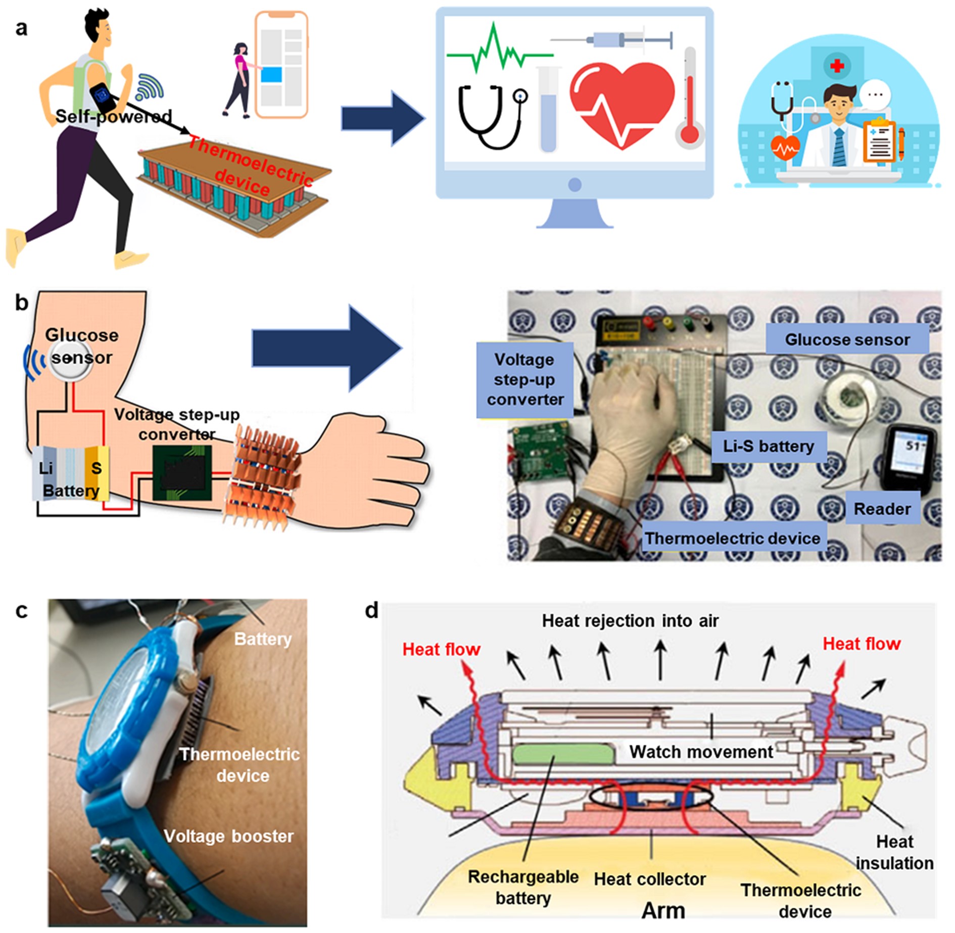 a) 使用热电式个人热管理为医疗设备供电的示意图,b) 利用Li-S电池为葡萄糖传感器供电的柔性热电式个人热管理的原理设计图和照片,c) 通过热电式个人热管理实现自供电的手表照片,d) 用于手表上自供电的可穿戴热电式个人热管理设计原理图。