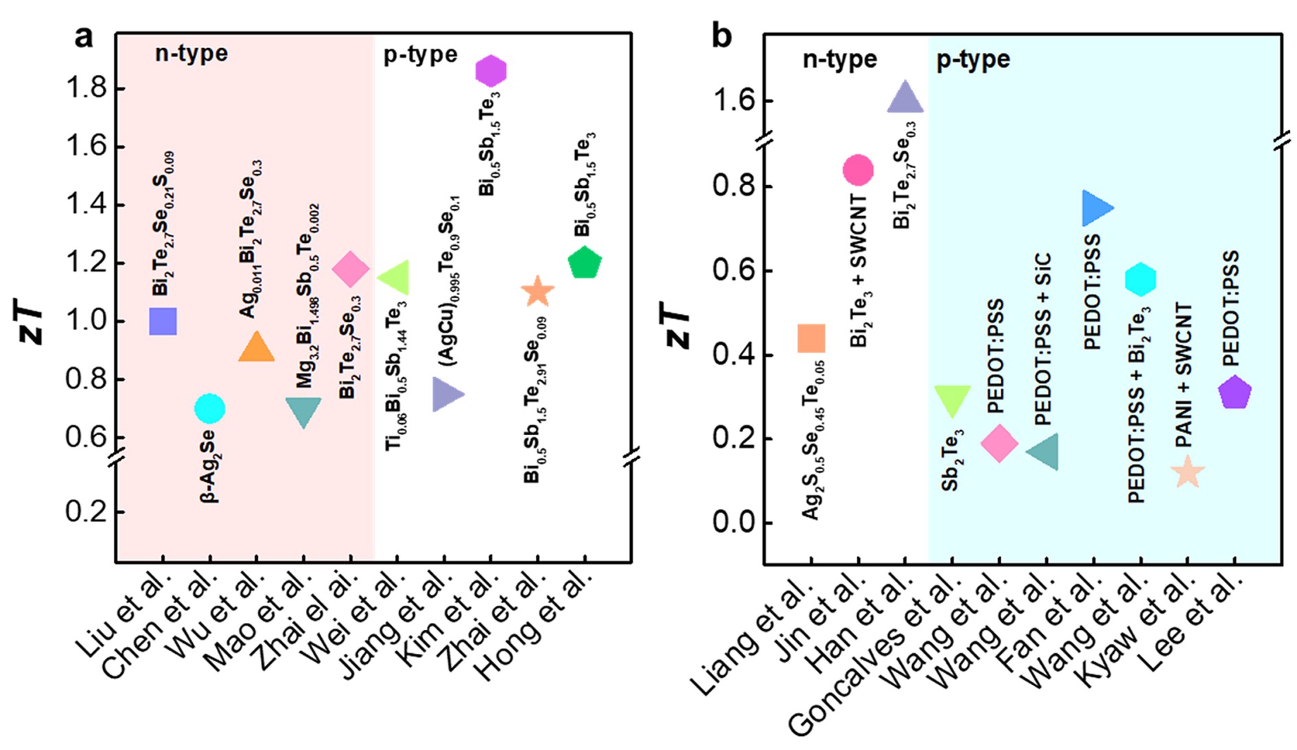 随着可穿戴电子设备和节能技术需求的不断增加,个人热管理可以利用人体废热来发电或对人体进行精确控温来实现个人热舒适,已经引起了广泛的研究兴趣。与其他个人热管理技术(如辐射冷却技术,压电技术等)相比,热电技术能够实现热与电的直接转换,从而可实现能量收集和个人温度调节的功能转换。热电式个人热管理的能量转换效率主要通过热电材料无量纲的品质因数zT =S2σT/κ来评估的,其中S,σ,T和κ分别为塞贝克系数,电导率,绝对温度和总热导率。