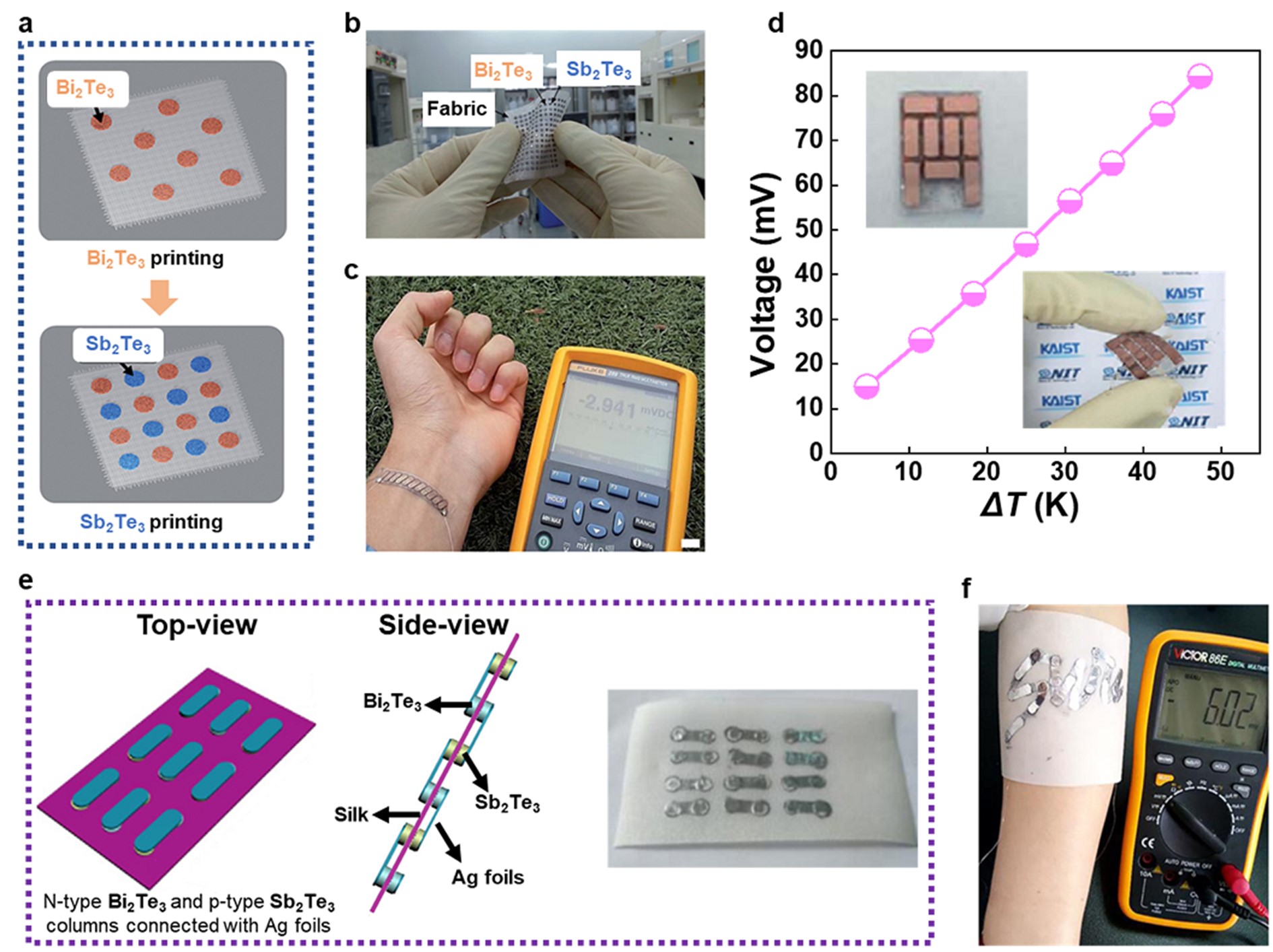 a) 在玻璃织物上丝网印刷Bi2Te3和Sb2Te3的工艺示意图,b) 玻璃织物上沉积的Bi2Te3基热电材料的照片,c) 穿戴在手腕上时输出性能测量,d) 输出电压随温差的变化,e) 在丝织物上直接沉积Bi2Te3和Sb2Te3制备可穿戴热电器件示意图,f) 穿戴在手臂上时输出性能测量。