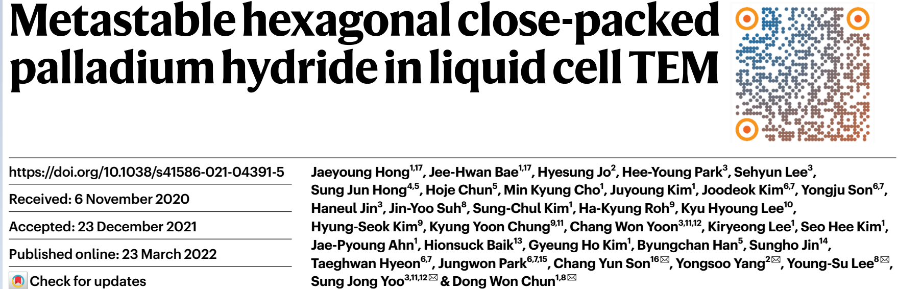 近日,韩国浦项HTH官网地址 大学的Chang Yun Son、韩国先进技术研究所的Yongsoo Yang、韩国科学技术研究院的Young-Su Lee和 Dong Won Chun、 Sung Jong Yoo及其团队在Nature上发表题为“Metastable hexagonal close-packed palladium hydride in liquid cell TEM”的研究成果。文章报道了利用液体环境透射电镜合成亚稳态的六方密排(hcp)氢化钯(PdHx)。溶液中前驱体浓度的独特相互作用能够稳定亚稳态hcp结构:氢(H)足量,有利于亚纳米尺度上hcp结构的形成,而Pd不足,会抑制晶体的进一步生长和向热力学稳定的面心立方结构的转变。这些研究发现为亚稳态设计策略提供了热力学参考,可用于发现新的亚稳态相。