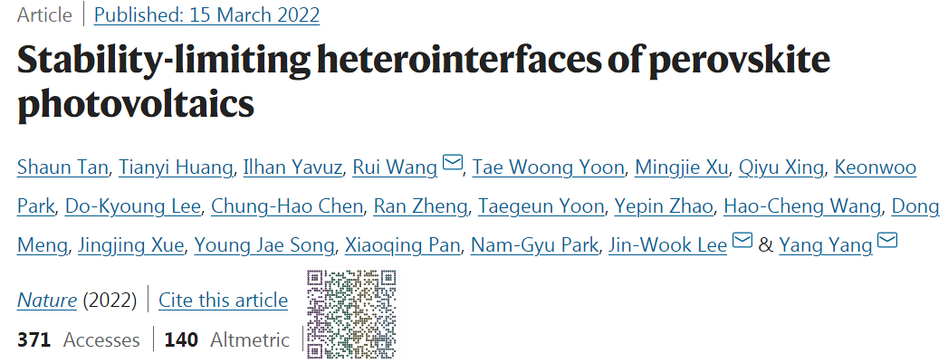 文献链接: Stability-limiting heterointerfaces of perovskite photovoltaics. Nature. 2022. DOI: 10.1038/s41586-022-04604-5.