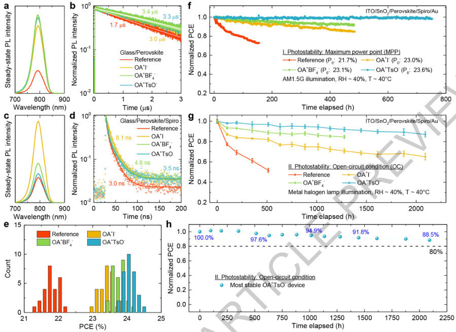 “有机铵盐表面处理是提升钙钛矿太阳能电池光电转换效率的有效手段,但是研究人员大多数把目光聚焦在如苯乙铵,辛铵,油铵等阳离子上,阴离子大多选择卤素离子而未被广泛关注。我们选择另辟蹊径,研究发现这些阴离子的作用并不可以被忽略,反而会造成表面功函的负偏移,使得表面形成电荷积累,从而对钙钛矿太阳能电池的长期稳定造成不良影响。因此我们设计了一系列有机阴离子,处理过后的钙钛矿表面功函并没有明显改变,实现了超过24.4%的光电转换效率,并且经过连续光照2000小时的加速测试后,仍然保持着超过87%的原始转换效率。”