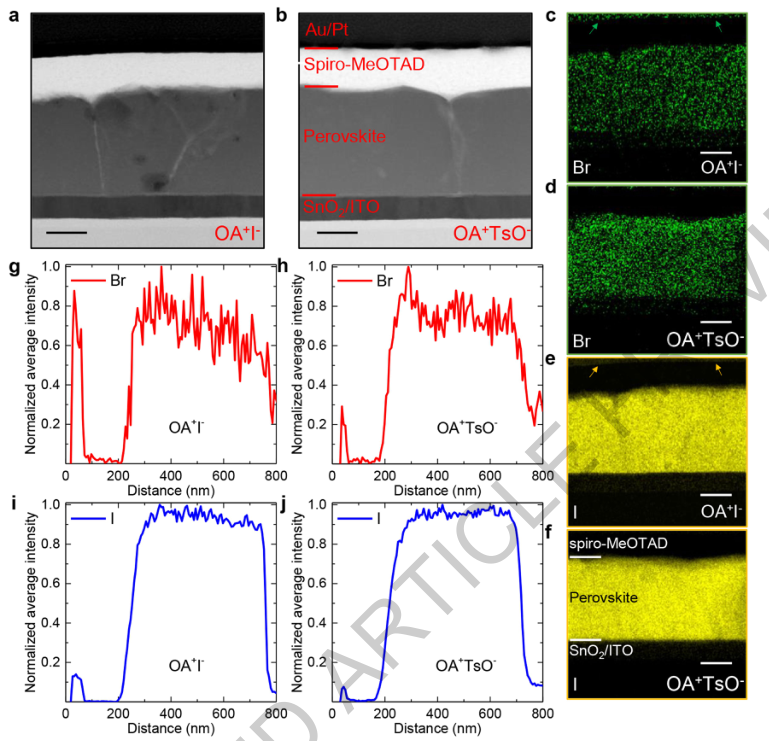 (c-f) Br和I元素的截面mapping,表明OAI处理后的器件发生了Br和I的转移。