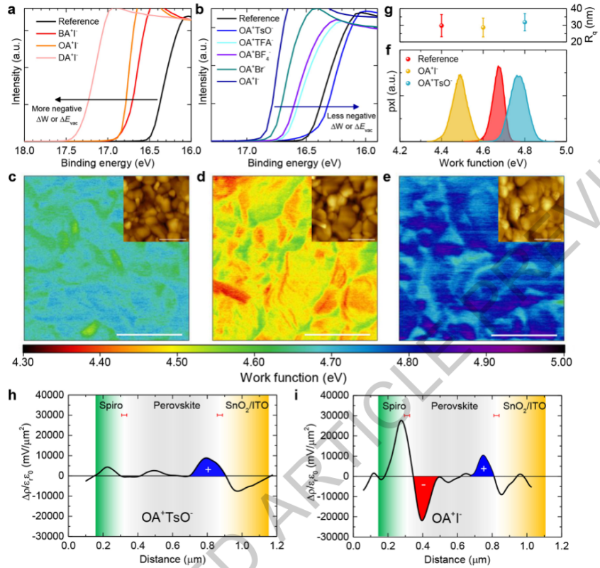 (c-e) c.未处理的钙钛矿薄膜的KPFM图;d. OAI处理后的钙钛矿薄膜的KPFM图,颜色变黄表明功函数变低;e. OATsO处理后的钙钛矿薄膜的KPFM图,颜色变蓝表明功函数增加。