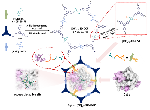 对酶的构象进行调控以优化其催化性能是固定化生物催化剂亟待解决的问题。共价有机框架(COFs)具有狭窄的通道和可调的孔隙环境,为酶的封装提供了一个有前途的平台。因此,北京理工大学王博教授和张媛媛助理教授将细胞色素c (Cyt c)共价固定在大小匹配的COFs通道中,通过优化共价相互作用可显著提高其稳定性和活性(相对于游离酶活性约600%)。对固定化Cyt c的结构分析表明,共价键可以诱导构象扰动,从而产生更多的活性位点。共价相互作用调制的有效性以及COFs的可定制受限通道为开发高性能生物催化剂提供了希望。该研究成果以“Enhancing Enzyme Activity by the Modulation of Covalent Interactions in the Confined Channels of Covalent Organic Frameworks”为题,发表在Angew. Chem. Int. Ed.上。DOI: 10.1002/anie.202201378。