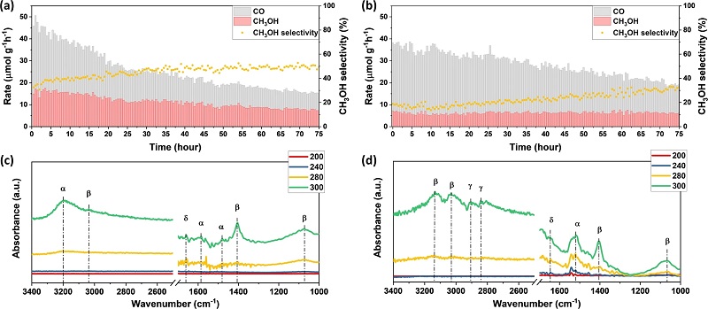 综上所述,作者通过固态合成方法成功地制备了一种新型黑色具有光热活性的氧化铟催化剂,在常压下甲醇选择性为30-50%。从实验和理论上探索了甲醇的途径,并揭示了串联反应方案的操作,其中来自RWGS的副产物CO作为原位原料用于形成甲醇。串联工艺将传统的竞争性RWGS和甲醇合成工艺转变为流动反应器系统中的组合反应途径。通过表面位点工程,新型黑色氧化铟光热催化剂克服了控制甲醇常规合成的热力学限制。在大气压条件下观察到的选择性提高,预示着可以开发新型催化剂用于生产可持续甲醇的太阳能精炼厂。